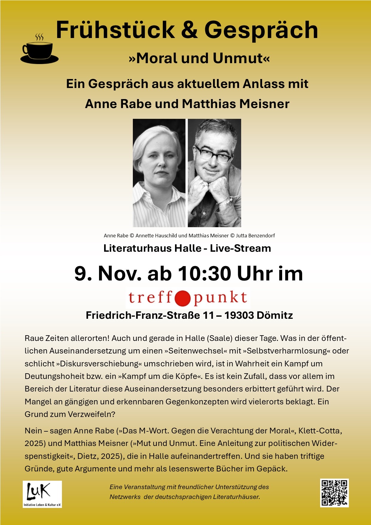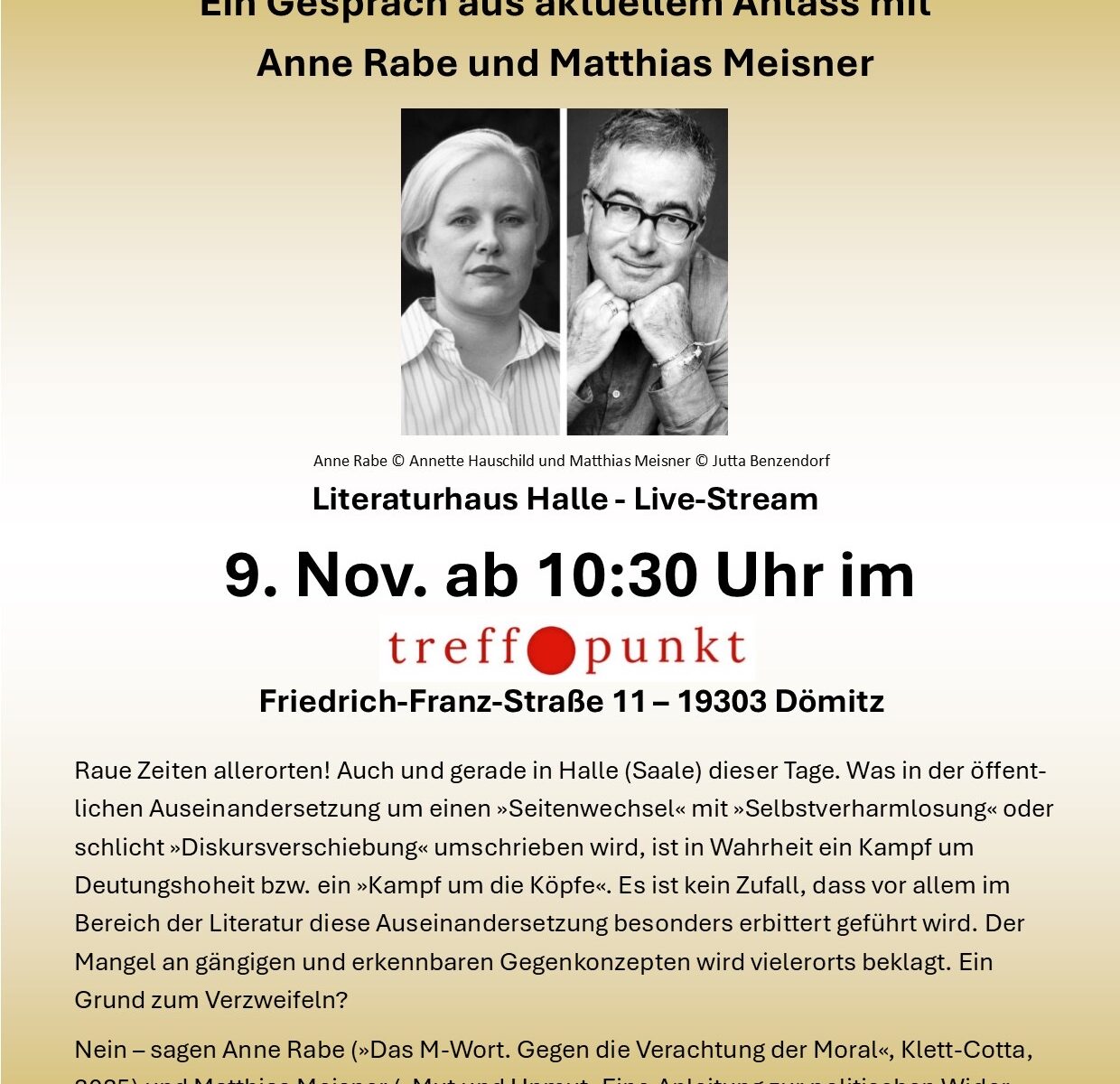 Nein – sagen Anne Rabe (»Das M-Wort. Gegen die Verachtung der Moral«, Klett-Cotta, 2025) und Matthias Meisner (»Mut und Unmut. Eine Anleitung zur politischen Wider-spenstigkeit«, Dietz, 2025), die in Halle aufeinandertreffen. Und sie haben triftige Gründe, gute Argumente und mehr als lesenswerte Bücher im Gepäck.