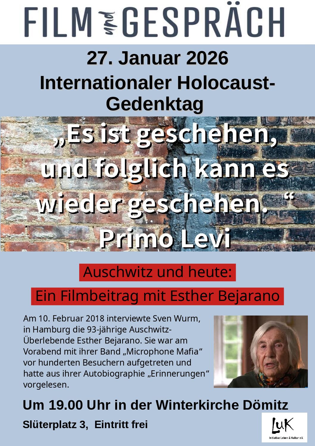 Am 10. Februar 2018 interviewte Sven Wurm in Hamburg die 93-jährige Auschwitz Überlebende Esther Bejarano. Sie war am Vorabend mit ihrer Band „Microphone Mafia" vor hunderten Besuchern aufgetreten und hatte aus ihrer Autobiographie „Erinnerungen" vorgelesen. Um 19.00 Uhr in der Winterkirche Dömitz, Slüterplatz 3 Eintritt frei